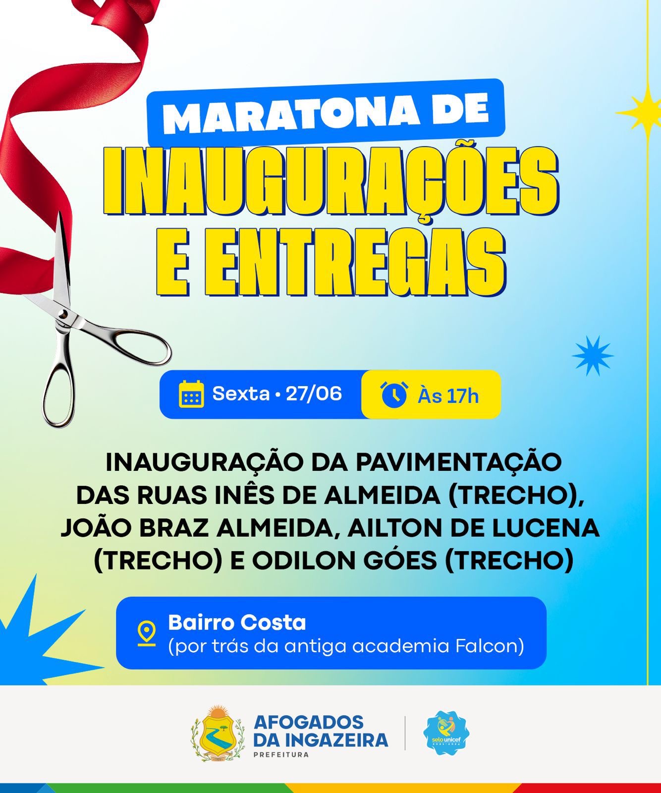 Dando sequência à maratona de inaugurações e entregas, a Prefeitura de Afogados da Ingazeira vai nesta sexta (27) ao bairro Costa, inaugurar ruas pavimentadas pela gestão.