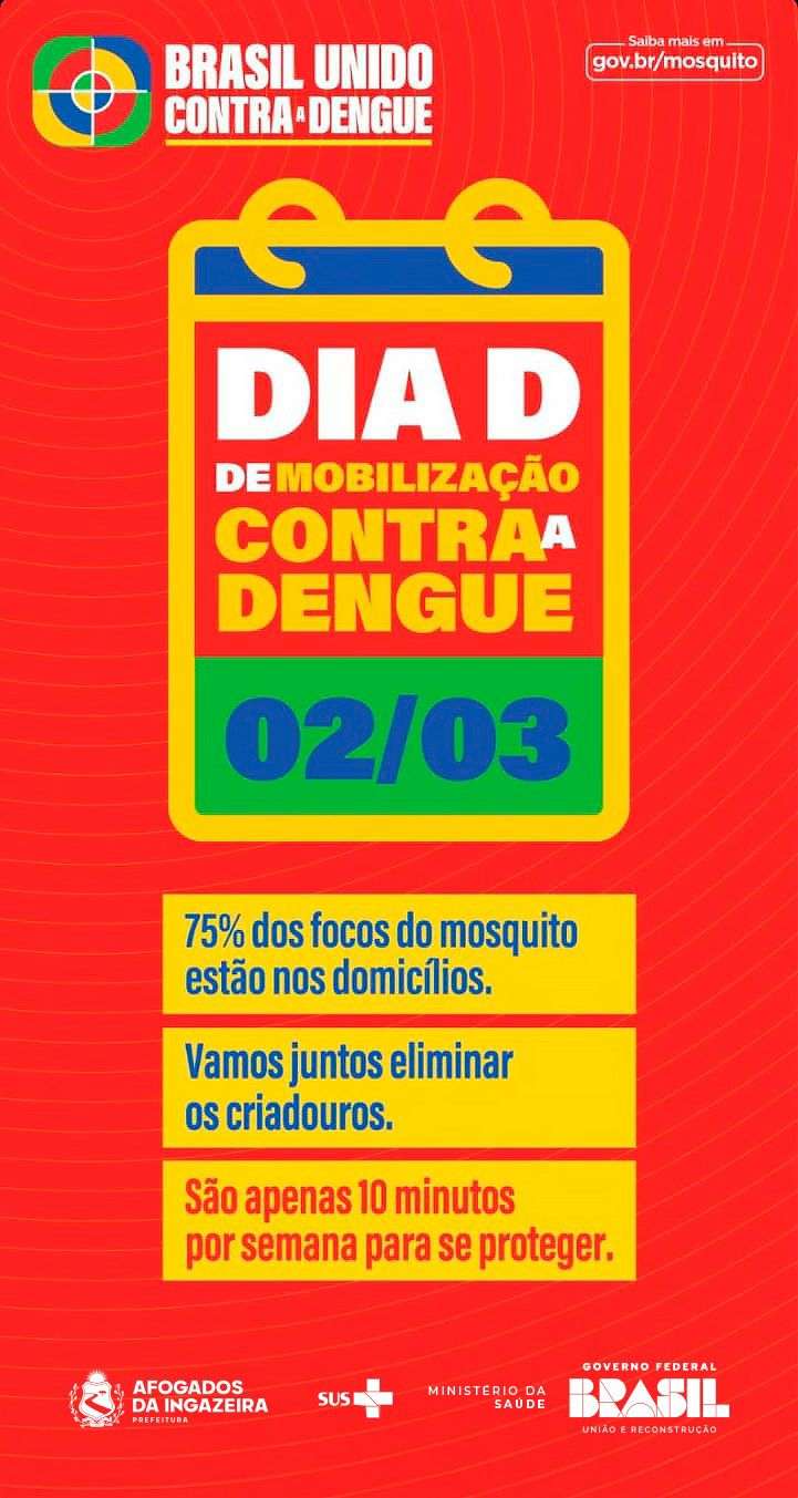E neste sábado (02), no dia determinado pelo Ministério da Saúde como dia “D” de mobilização contra a dengue, a Prefeitura de Afogados fará um mutirão no Conjunto Residencial Laura Ramos. A atividade terá início às 8h e irá reunir 40 profissionais da Secretaria Municipal de Saúde, envolvendo agentes de endemias, agentes comunitários de saúde, técnicos da vigilância em saúde dentre outros. A ordem é identificar e erradicar todo e qualquer foco do mosquito transmissor. No Sobreira, as atividades de combate e prevenção à dengue foram realizadas esta semana.