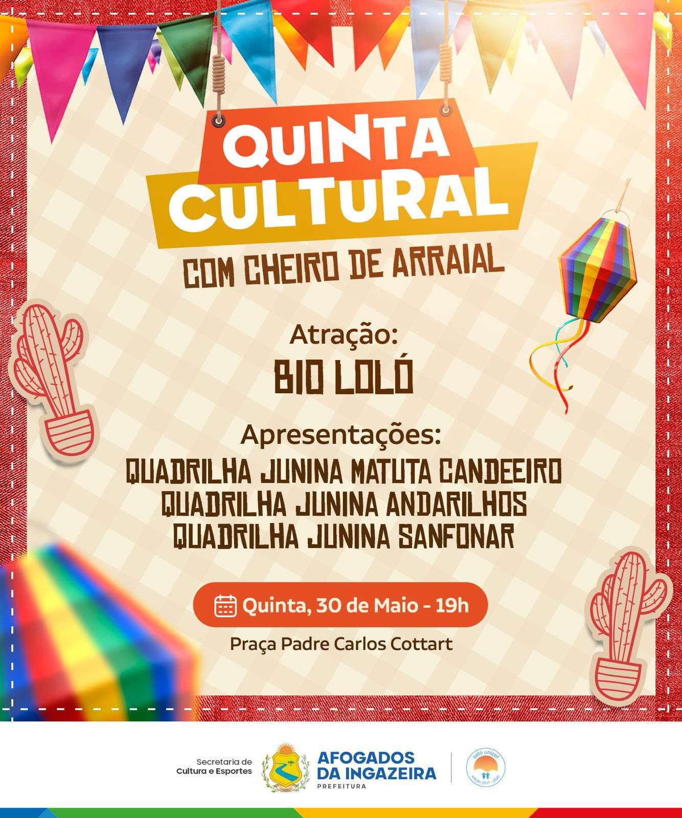 E para iniciar as festividades, a Prefeitura de Afogados dá o pontapé inicial realizando a Quinta Cultural com cheiro de arraial.