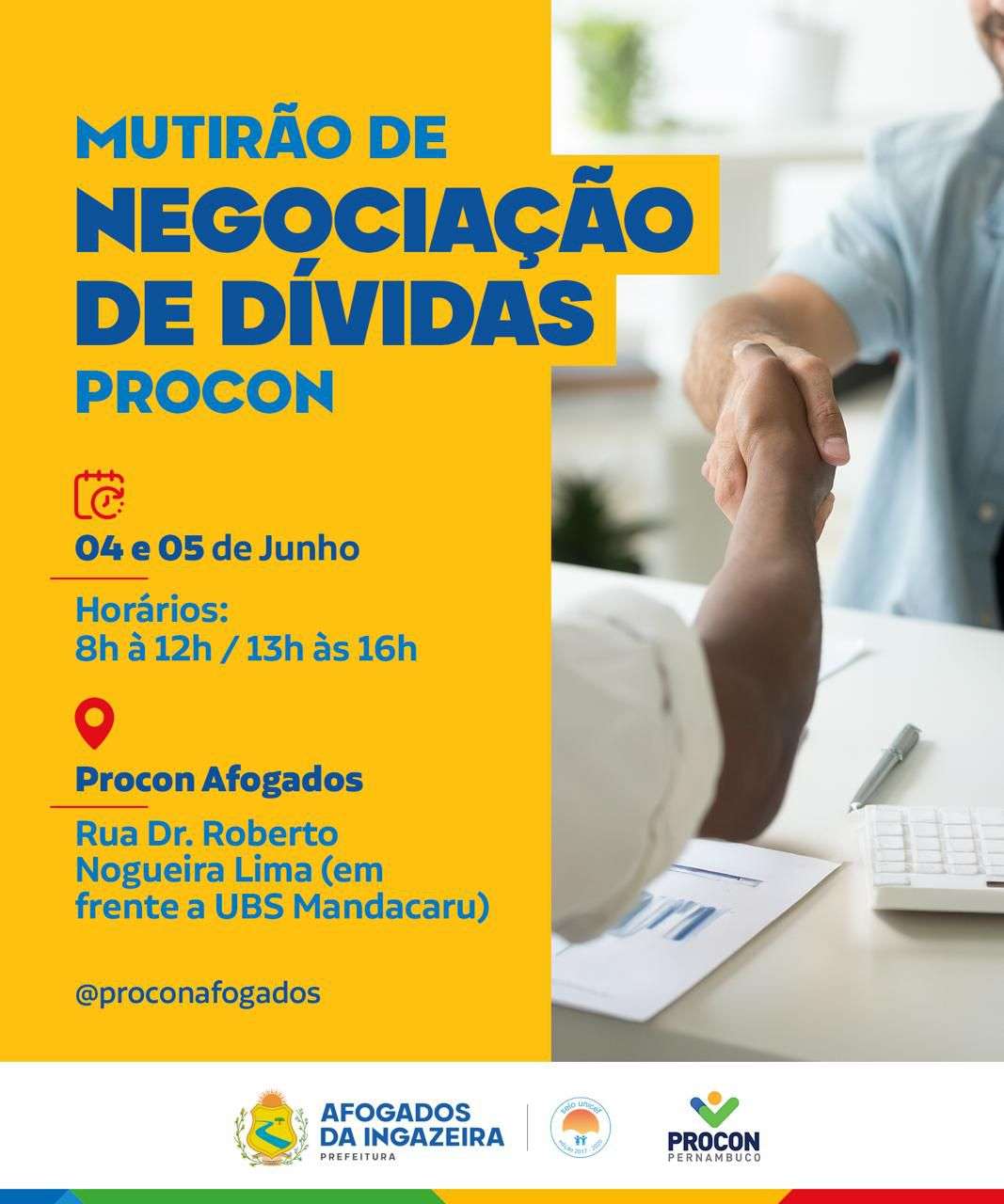 Nos dias 04 e 05 de Junho, moradores de Afogados poderão renegociar suas dívidas com instituições bancárias, operadoras de telefonia, Compesa e Prefeitura. Será o mutirão de renegociação de débitos, realizado em uma parceria entre o PROCON Pernambuco e o PROCON Afogados.