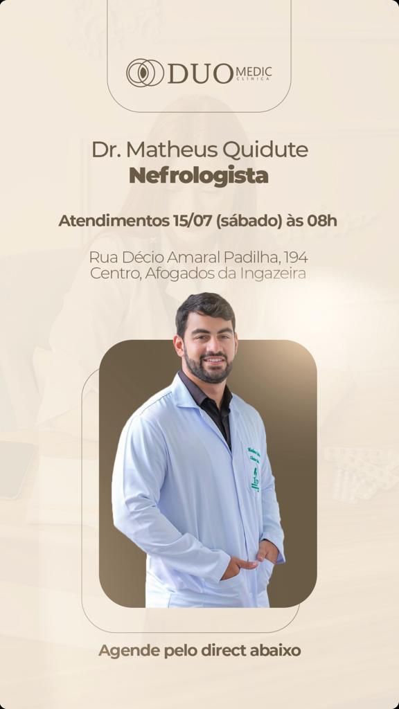 Afogados da Ingazeira esta de parabéns com a chegada do doutor Matheus Quidute que já está atendendo no endereço a cima citado. Éramos carente do atendimento da especialidade de nefrologia, agora com o doutor Matheus Quidute fica bem mais fácil cuidar de nossos rins. Obrigada doutor por ter se formado e não ter esquecido da nossa querida AFOGADOS DA INGAZEIRA. O senhor está fazendo muito bem a nossa região do Pajeú. Para quem não conhece o doutor Matheus Quidute, o mesmo é filho do secretário de administração Ney Quidute e bisneto de um dos maiores marchantes de Afogados da Ingazeira, seu Luiz Quidute, que também era um bom puxador de valsa.